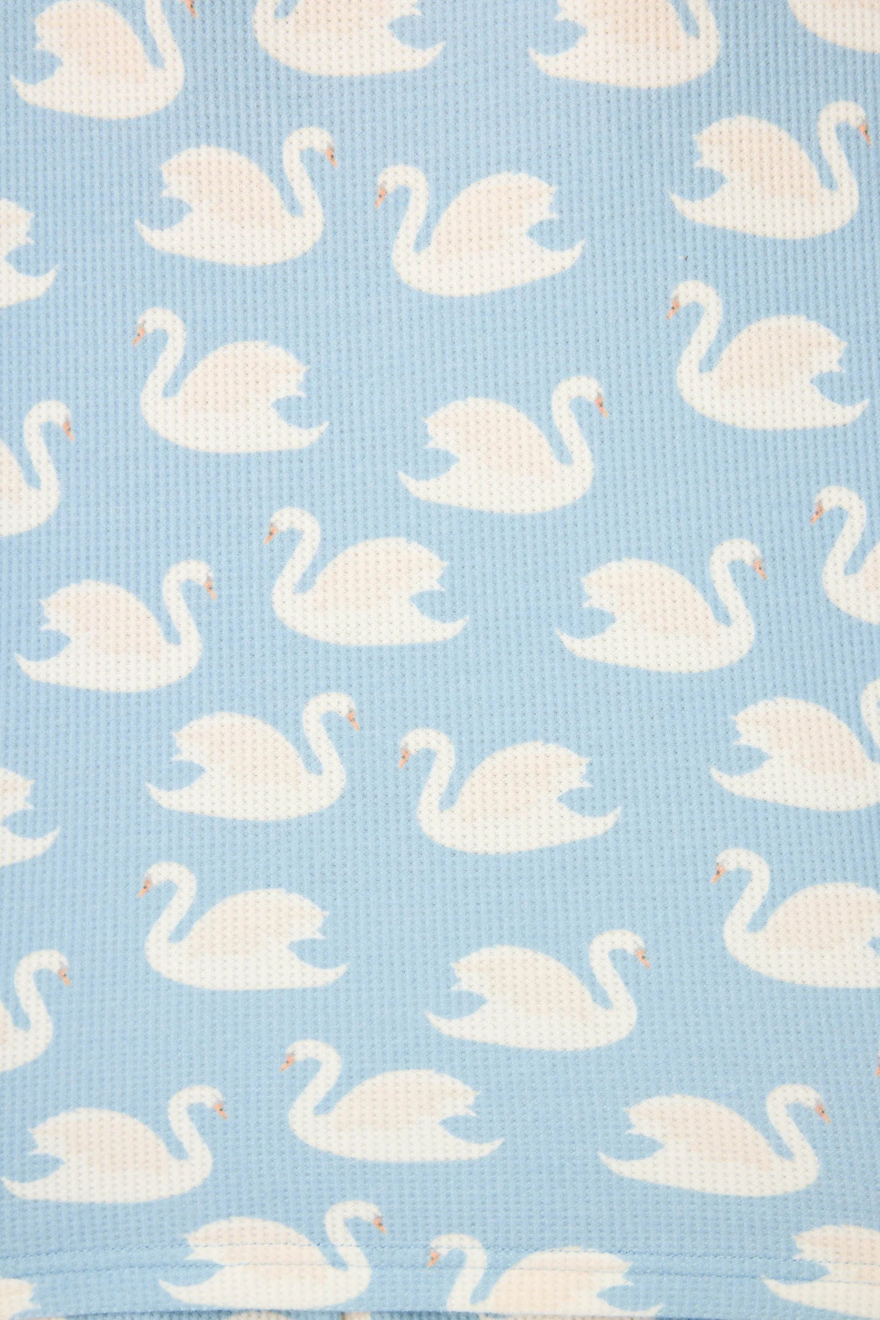 Women’s blue 2-piece boxer short set with swan print in baby peachy waffle fabric featuring a long sleeve top and boxer shorts.