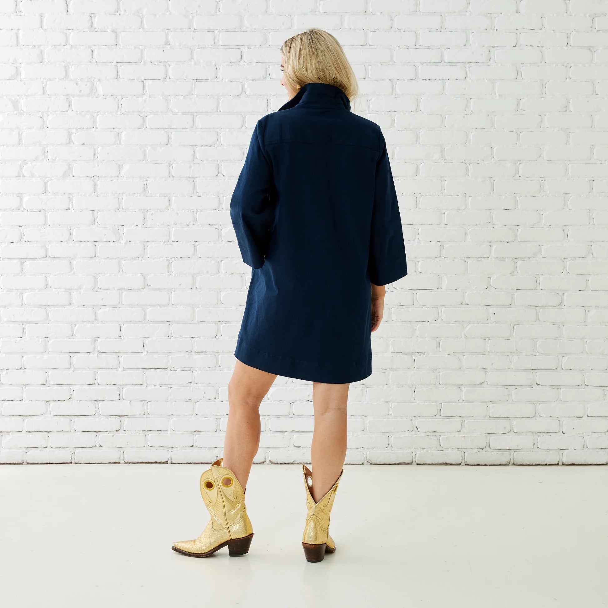 Classic, cool, and effortlessly elevated. The Chloe Dress is crafted from a soft stretch cotton denim that holds its shape while offering all-day comfort. Designed with a flattering A-line silhouette, collared neckline, and brushed gold button accents, this dress is that perfect blend of casual polish.