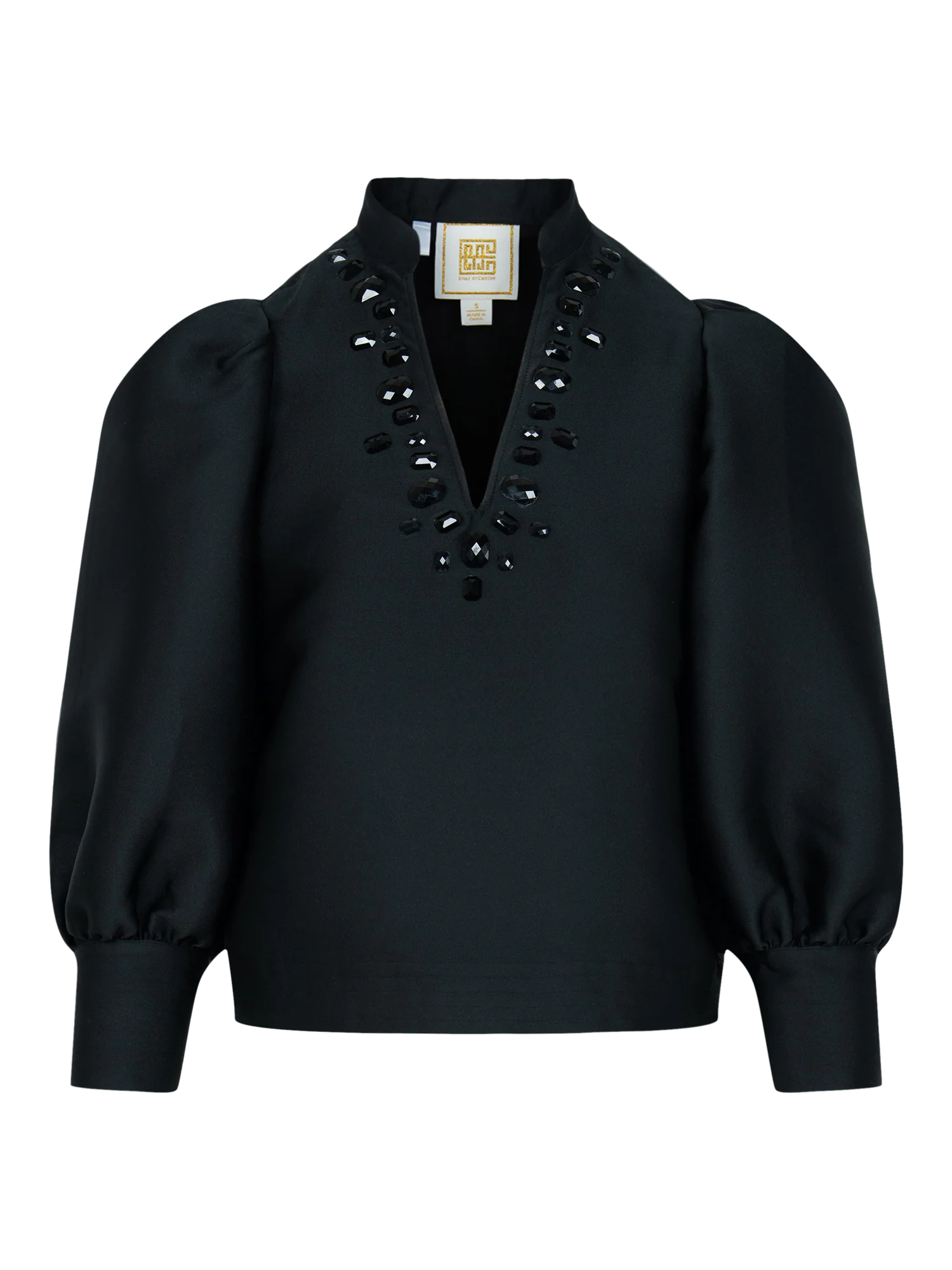 The Hampton Top in Midnight is structured perfection, designed with a lustrous finish and a hand-stoned neckline for an elevated touch. A mandarin-style collar frames the neckline, while puff sleeves with tapered cuffs add volume and balance. Its boxy yet tailored silhouette creates a refined shape that feels both modern and timeless. Style it with the matching Audrey Skirt for a tasteful statement look that’s perfect for elevated occasions this season.