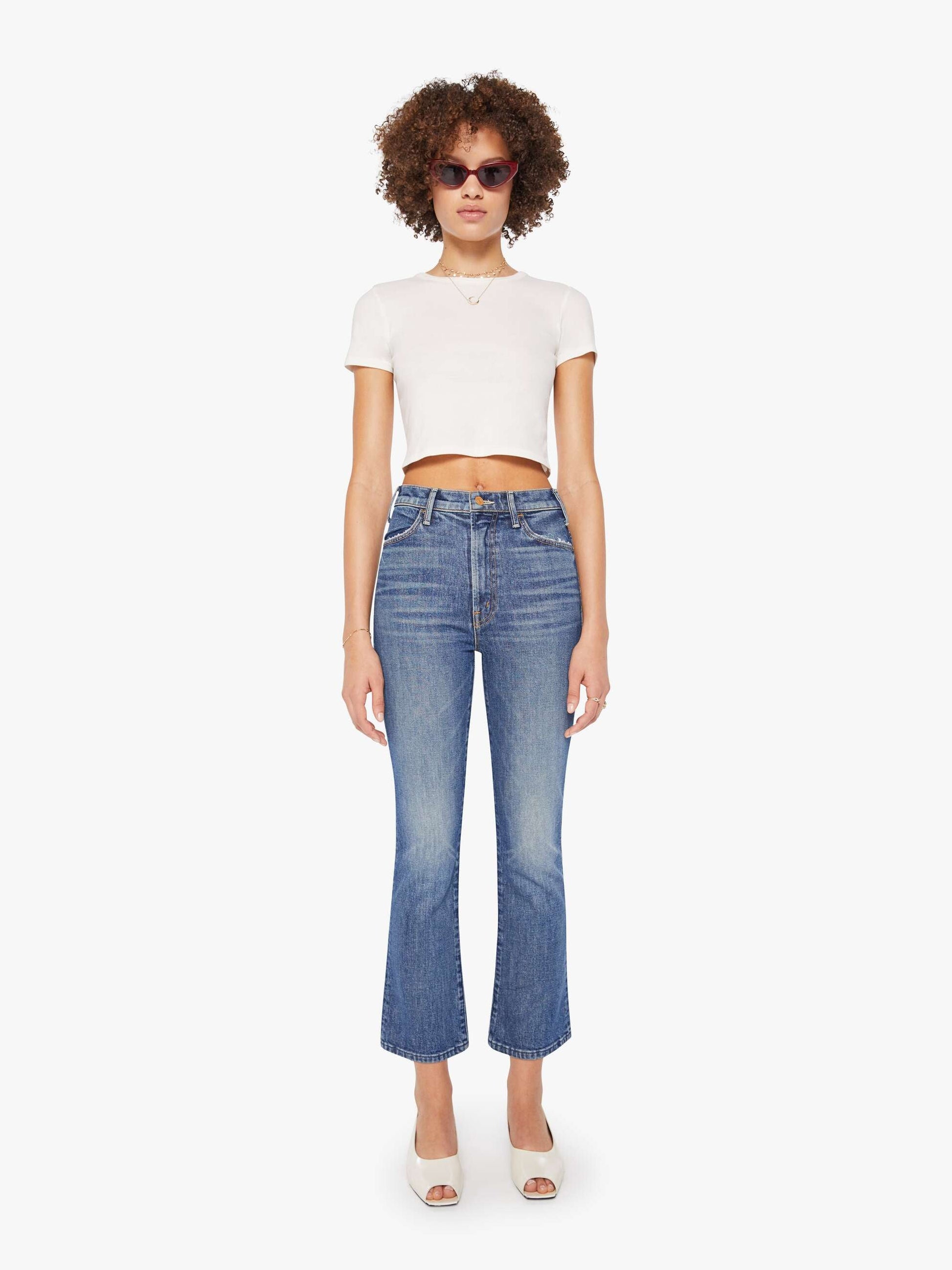 MOTHER makes the rules. This bestselling high-rise flare has a zip fly, ankle-length inseam and a clean hem. Crafted from semi-rigid denim, Bending The Rules is a mid-blue with whiskering and fading at the knees.