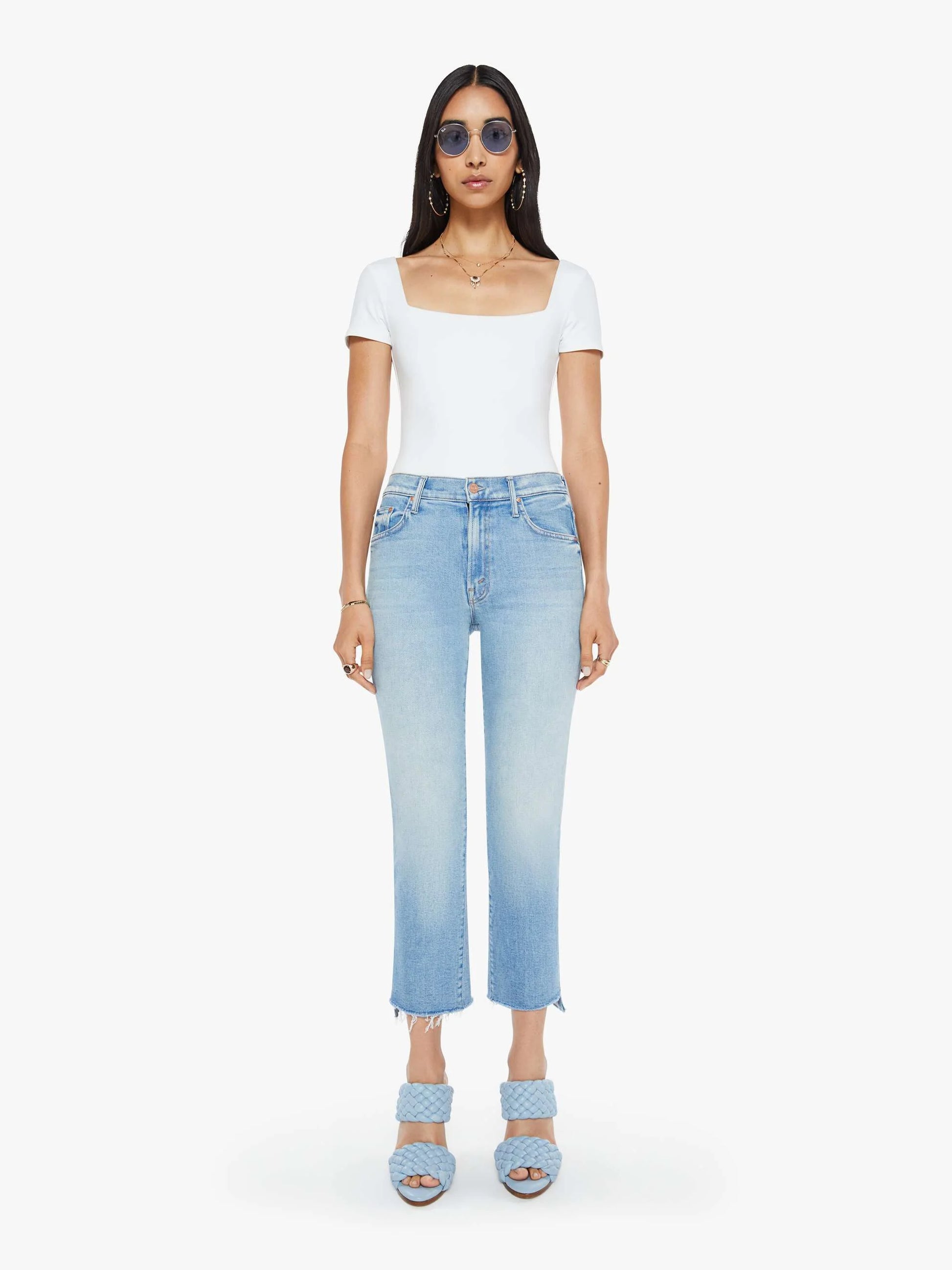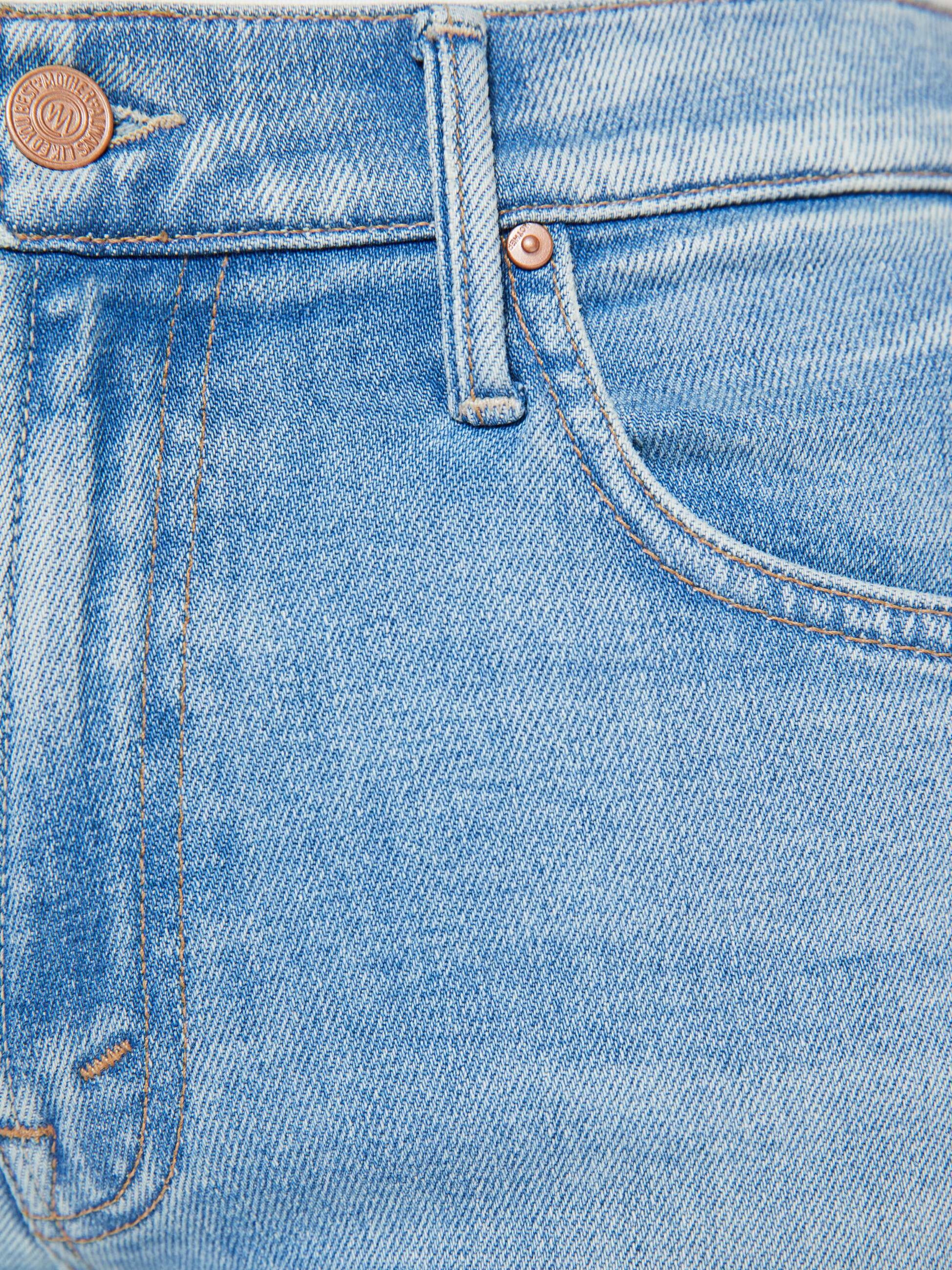 You in? This iconic high-waisted bootcut hits at the ankle with a frayed step-hem. Made from stretch denim, Can You Dig It is a light blue wash with subtle whiskering and fading throughout.